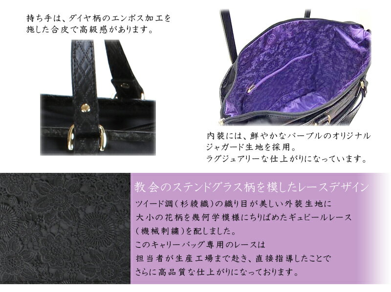 品番:D-255 サイズ:(総外寸) 約約45×39×19cm(3辺の合計=103cm) (本体サイズ) 約35×39×15cm 【機内持込可能サイズ】※100席以上の機種 重量:約2.5kg 容量:約17L 素材:(外装)ナイロン、合成皮革【レース部分】ポリエステル (内装)ポリエステル キャスター:60mm交換式キャスター ハンドル:5段階(85,80,75,70,65)で収縮可能 付属品:収納袋(ストラップ無し) ポケット:(前面)ファスナー×1 (内側)ファスナー×1/オープン×2 (側面)オープン左右各1 (背面)ファスナー×1 生産国:中国 ♪