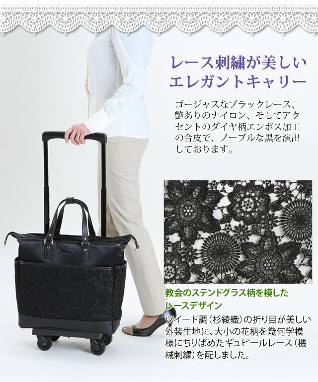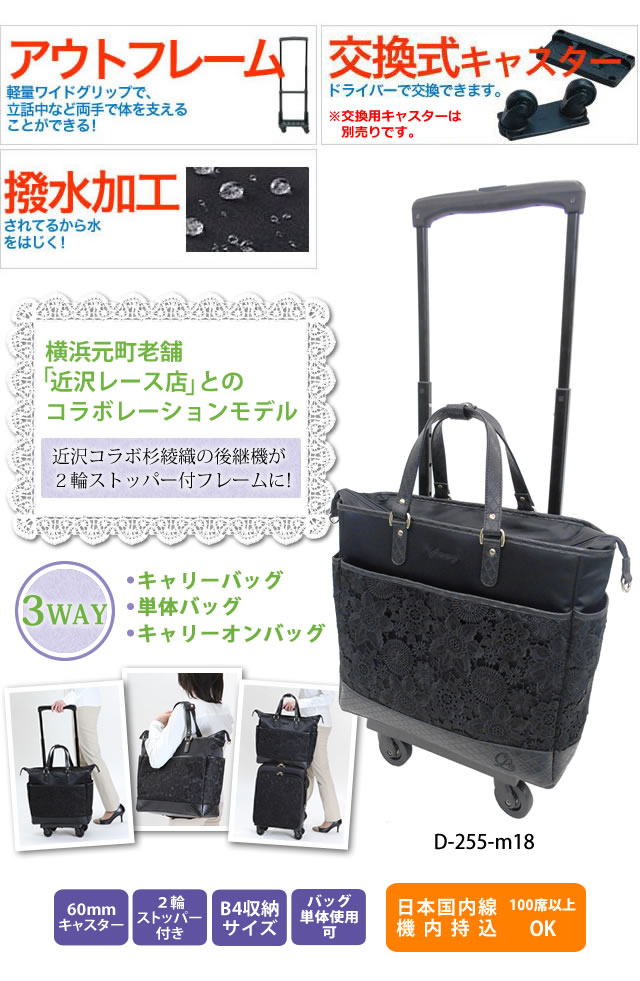 レース刺繍が美しいエレガントキャリー!近沢コラボ杉綾織の後継機が2輪ストッパー付フレームとリニューアルしました!3WAY仕様(キャリーバッグ/キャリーオンバッグ/単体バッグ)※バッグを取り外して単体としても使えるアウトフレーム ・前ポケット生地はゴージャスなブラックレース。